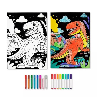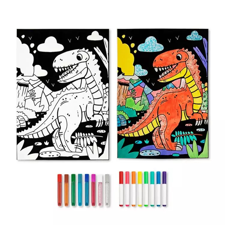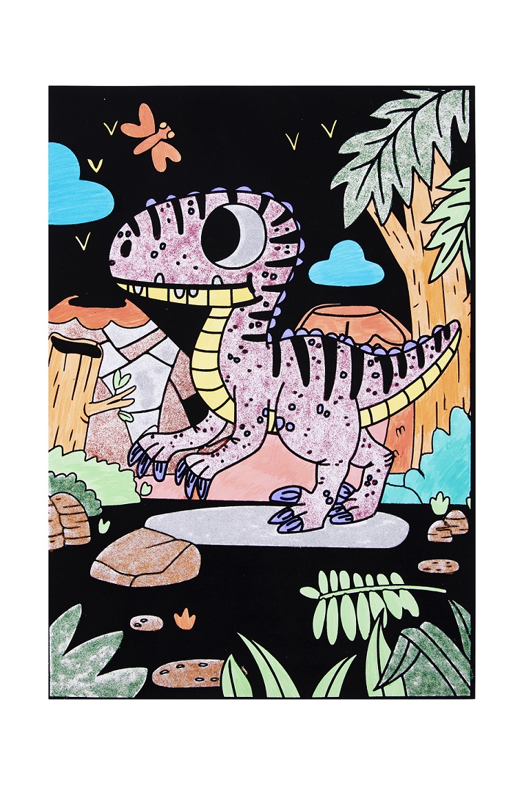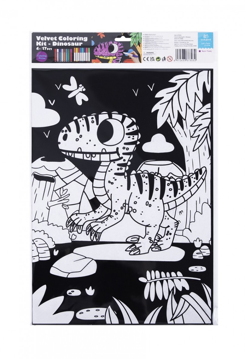 Το σετ Ζωγραφική σε Βελούδο Δεινόσαυρος αποτελείται από μία εικόνα με βελούδο, 8 μαρκαδόρους και 8 κόλλες με χρωματιστό γκλίτερ.