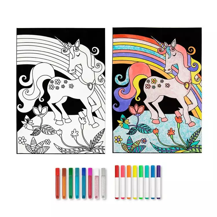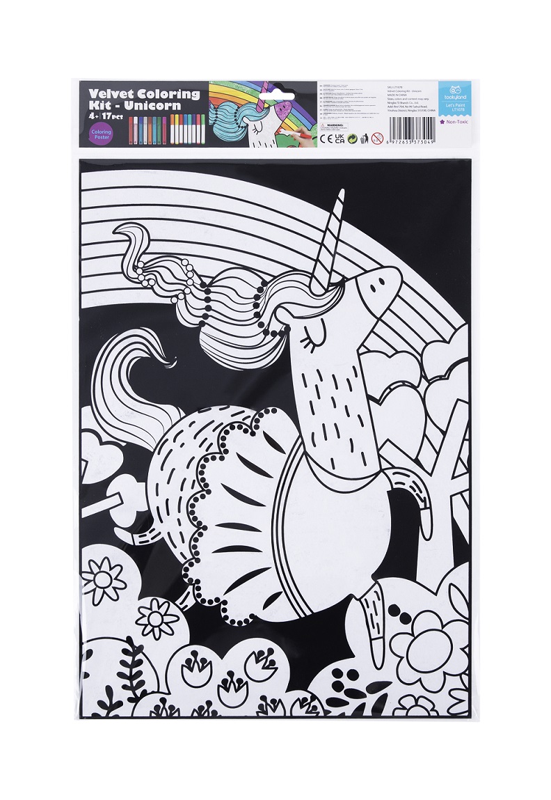 Το σετ Ζωγραφική σε Βελούδο Μονόκερος αποτελείται από μία εικόνα με βελούδο, 8 μαρκαδόρους και 8 κόλλες με χρωματιστό γκλίτερ.