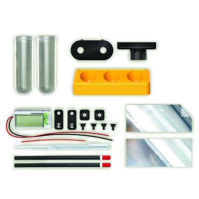 ΠΕΡΙΕΧΟΜΕΝΑ: Βάση δοκιμαστικού σωλήνα, Καπάκι δοκιμαστικού σωλήνα, Δοκιμαστικοί σωλήνες x 2, Βάση ρολογιού, Ρολόι, Σταγονόμετρο, Μακριά κλιπ σύνδεσης x 2, Κοντά κλιπ σύνδεσης x 2, Καπάκια ακροδεκτών x 4, Καλώδιο, Μολύβια x 2, Φύλλα αλουμινόχαρτου x 2.