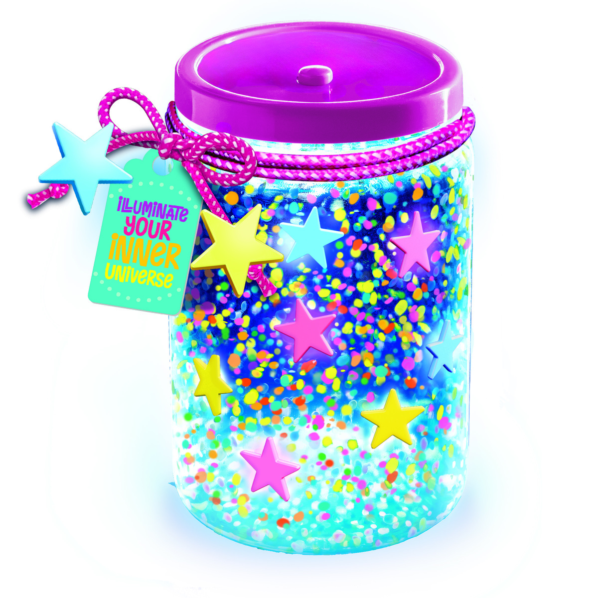 Ζωγράφισε το βάζο με το ειδικό εργαλείο για κουκκίδες. Κόλλησε μικρά και μεγάλα, λαμπερά αστέρια για να το διακοσμήσεις και γράψε ένα μήνυμα στην ετικέτα. Τοποθέτησε το καπάκι LED αφού αφαιρέσεις το προστατευτικό φύλλο και πάτησε το κουμπί. Απόλαυσε τα όμορφα μοτίβα γαλαξία που προβάλουν μέσα από το βάζο!