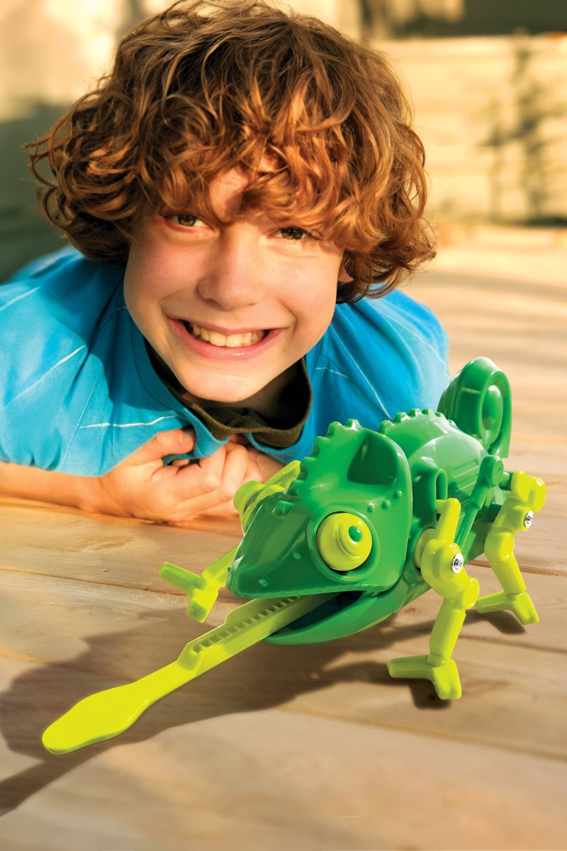 Φτιάξε το δικό σου Ρομπότ Χαμαιλέοντα και δες το να ζωντανεύει μπροστά στα μάτια σου! Με κάθε κίνηση, θα παρακολουθείς τη γλώσσα του να ξεδιπλώνεται, τα μάτια του να περιστρέφονται και τα πόδια του να κινούνται όπως ενός αληθινού χαμαιλέοντα. Ένα διασκεδαστικό και εκπαιδευτικό παιχνίδι που εξάπτει τη φαντασία και καλλιεργεί τις δεξιότητες μηχανικής των παιδιών.