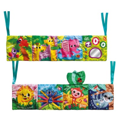 Κάντε το παιχνίδι του μωρού σας συναρπαστικό με ένα υπέροχο παιχνίδι 2 σε 1 - προστατευτικό κούνιας και βιβλίο! Αυτή η διπλής όψης πτυσσόμενη πανοραμική σκηνή ζωολογικού κήπου διαθέτει πολύχρωμα ζώα με σχέδιο κατάλληλο για την ηλικία και προσφέρει εκπληκτικά στοιχεία δραστηριότητας σε κάθε δίπλωμα - τα μικρά μπορούν να αγγίξουν διαφορετικές υφές, να ακούσουν ήχους, θροΐσματα, να παίξουν με το ασφαλές καθρεφτάκι για μωρά. Η εξερεύνηση των ερεθισμάτων αφής αυτού του πολυλειτουργικού προστατευτικού κούνιας είναι εξαιρετικά ωφέλιμη για τις λεπτές κινητικές δεξιότητες των μωρών και την ανάπτυξη του συντονισμού χεριού-ματιού. Το προστατευτικό στερεώνεται εύκολα στην κούνια, καθώς έχει πολλά λουράκια για δέσιμο. Μεγάλη διασκέδαση την ημέρα και απόλυτη ασφάλεια τη νύχτα!