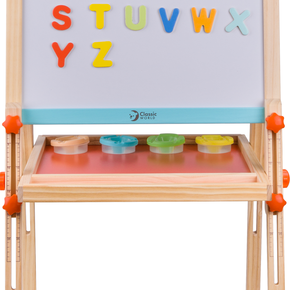 Αυτός ο ξύλινος μαγνητικός πίνακας διαθέτει μαυροπίνακα και μαγνητικό λευκό πίνακα, ιδανικούς για να δημιουργούν τα παιδιά όμορφες ζωγραφιές. Στα πλαϊνά του έχει διαβαθμισμένη κλίμακα για εύκολη ρύθμιση ύψους, ώστε να προσαρμόζεται ανάλογα με την ηλικία. Συμπεριλαμβάνονται πλαστικά ποτηράκια για χρώματα και μαγνητικά αγγλικά γράμματα. Ένα υπέροχο εργαλείο για να μάθουν τα παιδιά αγγλικά και να αναπτύξουν τη δημιουργικότητά τους!