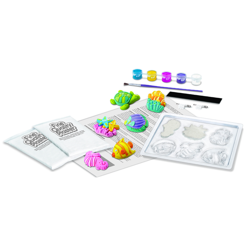 ΠΑΡΑΣΚΕΥΗ: Προετοίμασε το μείγμα του γύψου, ακολουθώντας πιστά τις οδηγίες όπως αναγράφονται στη συσκευασία. Ρίξε το μείγμα του γύψου στα καλούπια και ανακίνηδε τα ελαφρά. Άφησε τον γύψο να στερεοποιηθεί για λίγη ώρα και ζωγράφισε τις θαλάσσιες φιγούρες με τα χρώματα που περιλαμβάνονται.