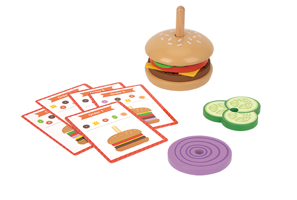Το ξύλινο παιχνίδι μπέργκερ με κάρτες θα απασχολήσει δημιουργικά το παιδί, ενώ παράλληλα ενθαρρύνει την ανάπτυξη της οπτικής και συνδυαστικής αντίληψης, τις λεπτές κινητικές δεξιότητες και τον συντονισμό χεριού και ματιού. Επίσης, είναι μια μορφή παιχνιδιού που προσομοιώνει τις κοινωνικές σχέσεις και τις λειτουργίες της κοινωνίας, καθώς δίνεται η ευκαιρία στα παιδιά να πειραματιστούν με τη μαγειρική και να αλληλοεπιδράσουν με τους γύρω τους με αφορμή το φαγητό.