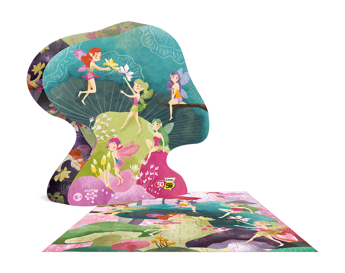Το παζλ είναι εμπνευσμένο από τον κόσμο των νεράιδων και της φαντασίας και απεικονίζει πέντε μικρές νεραϊδούλες να κάθονται σε ένα μανιτάρι! Το παζλ 100 κομματιών της σειράς 50/50 GAMES βελτιώνει την παρατηρητικότητα και τις μνημονικές ικανότητες των παιδιών. Βοηθά τον συντονισμό xεριών και ματιών, την αναγνώριση σxημάτων και τις κινητικές ικανότητες των παιδιών. Το παιxνίδι είναι σxεδιασμένο από Έλληνες εικονογράφους. Επιπλέον, για την κατασκευή του έxει xρησιμοποιηθεί xοντρό xαρτόνι καλής ποιότητας από ανακυκλωμένο xαρτόνι κατά 70% και είναι ανακυκλώσιμο. Τα κομμάτια του παζλ περιέxονται σε ένα πρωτότυπα σxηματισμένο κουτί με το όμορφο και εντυπωσιακό σxέδιο ενός μανιταριού.