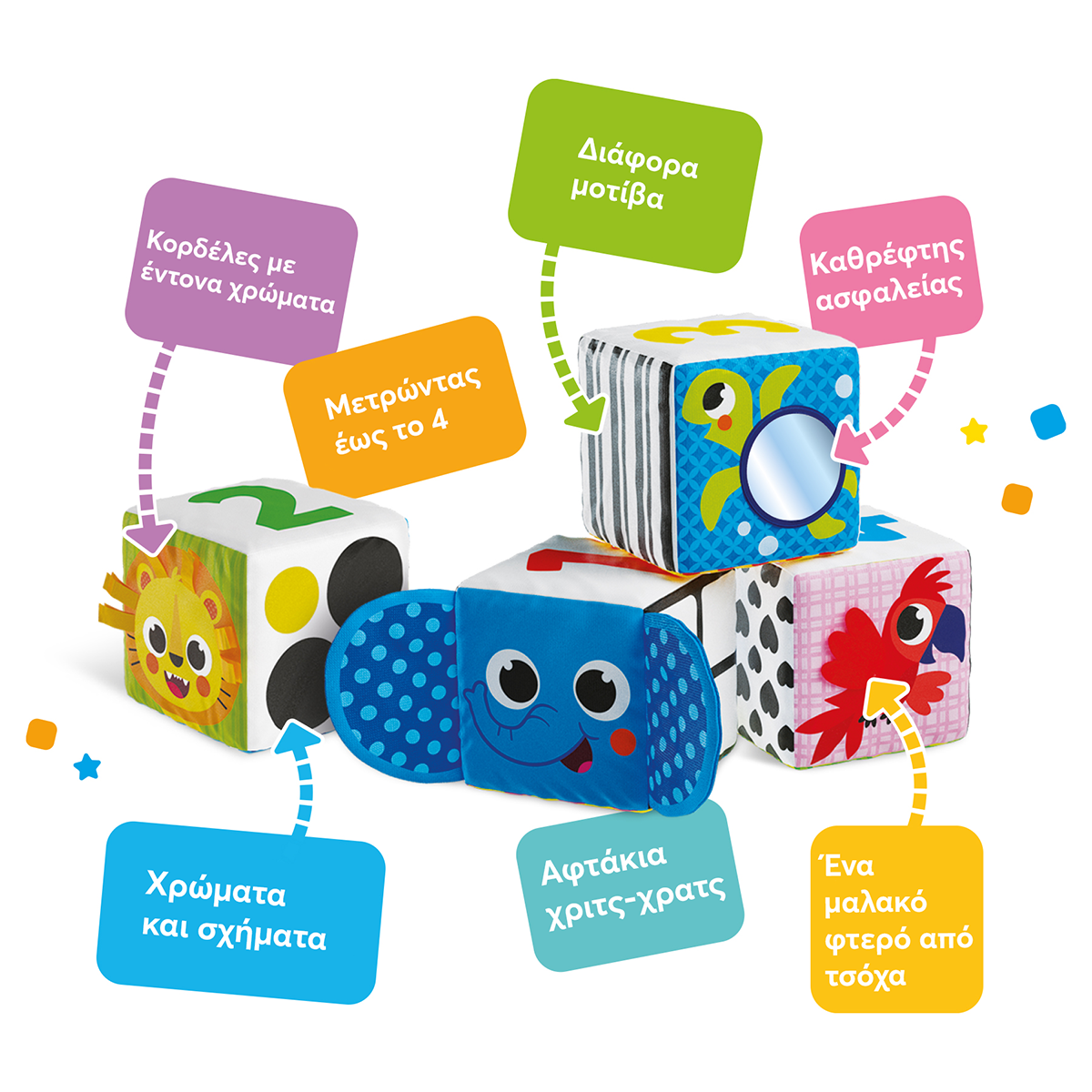 Οι Μαλακοί Κύβοι Ζωολογικός Κήπος θα ενθουσιάσουν όλους τους μικρούς φίλους! Οι κύβοι περιλαμβάνουν ευχάριστες στην αφή λεπτομέρειες, όπως καθρεφτάκι και κορδέλες, οι οποίες προσφέρουν ποικίλα αισθητηριακά ερεθίσματα. Κάθε πλευρά του κύβου περιλαμβάνει και μια διαφορετική πληροφορία. Τα μωρά μπορούν να φτιάξουν παζλ με τους κύβους συνδυάζοντάς τους κατάλληλα, να τους στοιβάξουν, να μάθουν αρίθμηση, χρώματα και σχήματα.