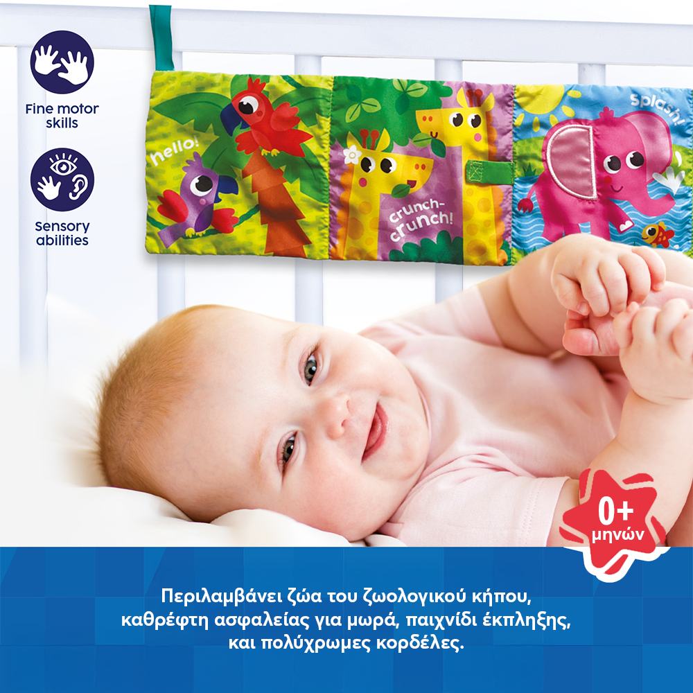 Κάντε το παιχνίδι του μωρού σας συναρπαστικό με ένα υπέροχο παιχνίδι 2 σε 1 - προστατευτικό κούνιας και βιβλίο! Αυτή η διπλής όψης πτυσσόμενη πανοραμική σκηνή ζωολογικού κήπου διαθέτει πολύχρωμα ζώα με σχέδιο κατάλληλο για την ηλικία και προσφέρει εκπληκτικά στοιχεία δραστηριότητας σε κάθε δίπλωμα - τα μικρά μπορούν να αγγίξουν διαφορετικές υφές, να ακούσουν ήχους, θροΐσματα, να παίξουν με το ασφαλές καθρεφτάκι για μωρά. Η εξερεύνηση των ερεθισμάτων αφής αυτού του πολυλειτουργικού προστατευτικού κούνιας είναι εξαιρετικά ωφέλιμη για τις λεπτές κινητικές δεξιότητες των μωρών και την ανάπτυξη του συντονισμού χεριού-ματιού. Το προστατευτικό στερεώνεται εύκολα στην κούνια, καθώς έχει πολλά λουράκια για δέσιμο. Μεγάλη διασκέδαση την ημέρα και απόλυτη ασφάλεια τη νύχτα!